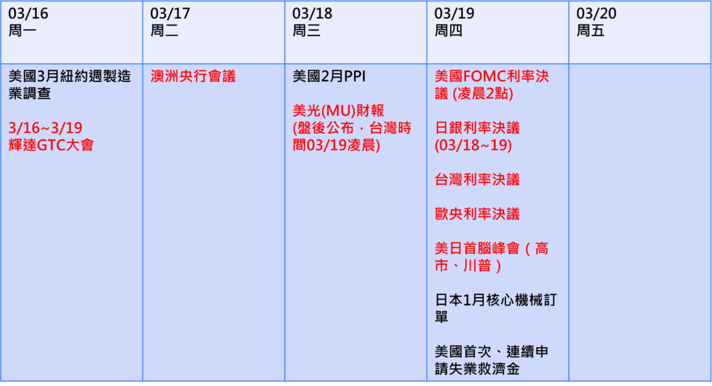 市場最矚目的是黃仁勳預告將亮相的「前所未見的晶片」,若細節超出預期,將是AI供應鏈估值重估最直接的催化劑。3/17 NVIDIA另有財務分析師問答會,是機構投資人確認資本支出規模與產品路徑能見度的重要窗口。衝突期間市場情緒動盪,GTC是本週最有機會帶動AI供應鏈族群率先回補的事件節點,台韓AI股能見度高的個股反應將是最先行的情緒指標。搭配本週美光(MU)將公布財報,HBM需求動能的確認是記憶體族群本週最重要的基本面驗證。